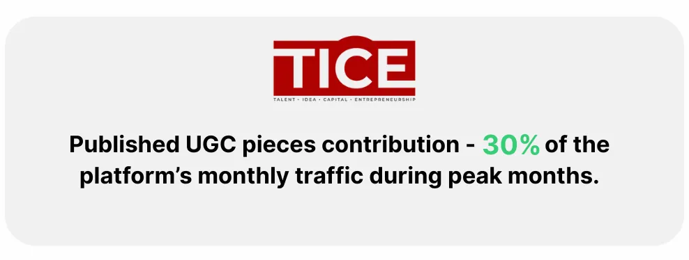 Published UGC pieces contributed to over 30% of the platform’s monthly traffic during peak months.