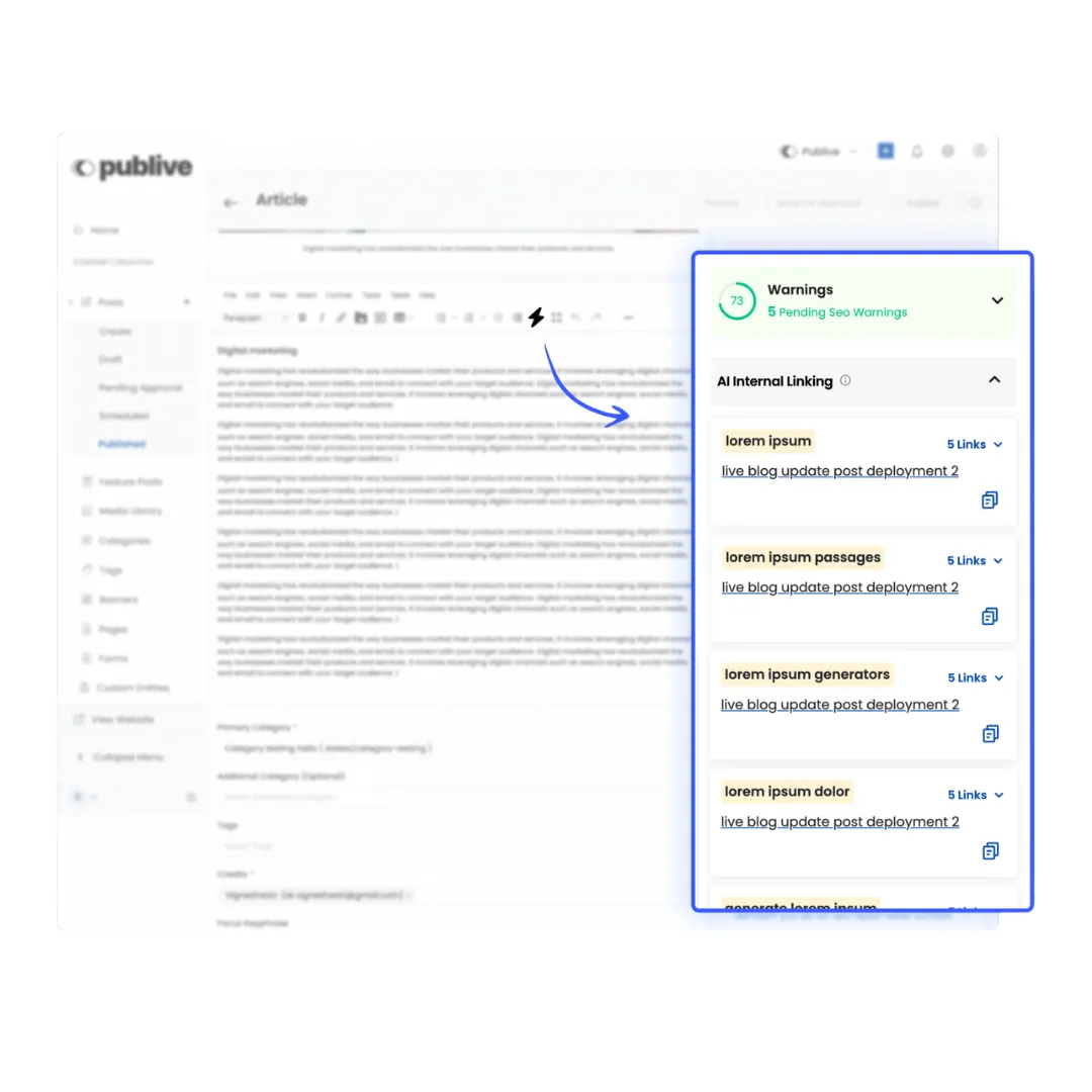 At Publive, we focus on making the process of internal linking impactful & scalable. This is supported by our internal linking feature which encourages better content connections, enhances SEO, and improves user experience by guiding readers to more related content. This includes AI-powered recommendations and Smartlinks, which automatically insert contextually relevant links across your content.